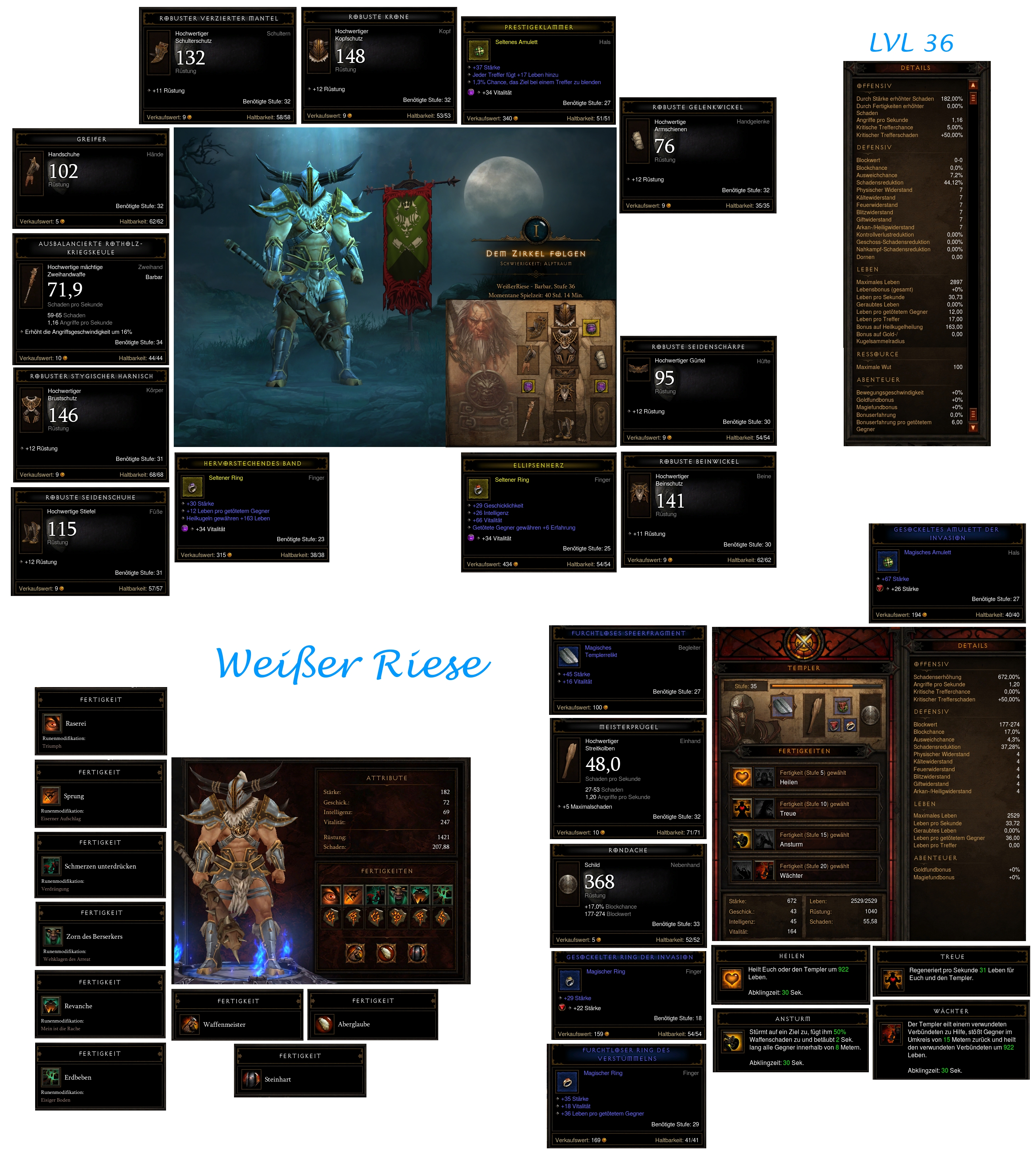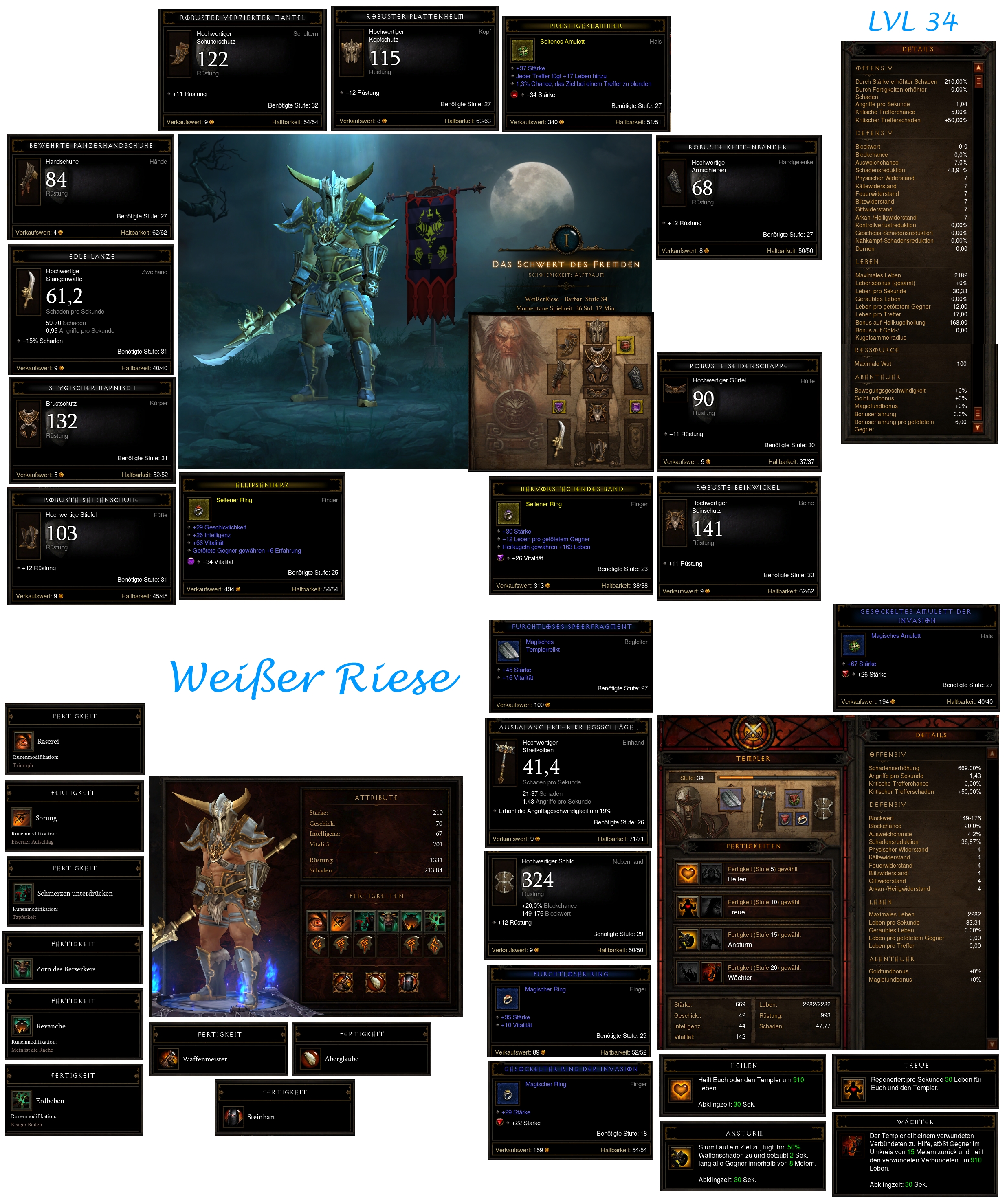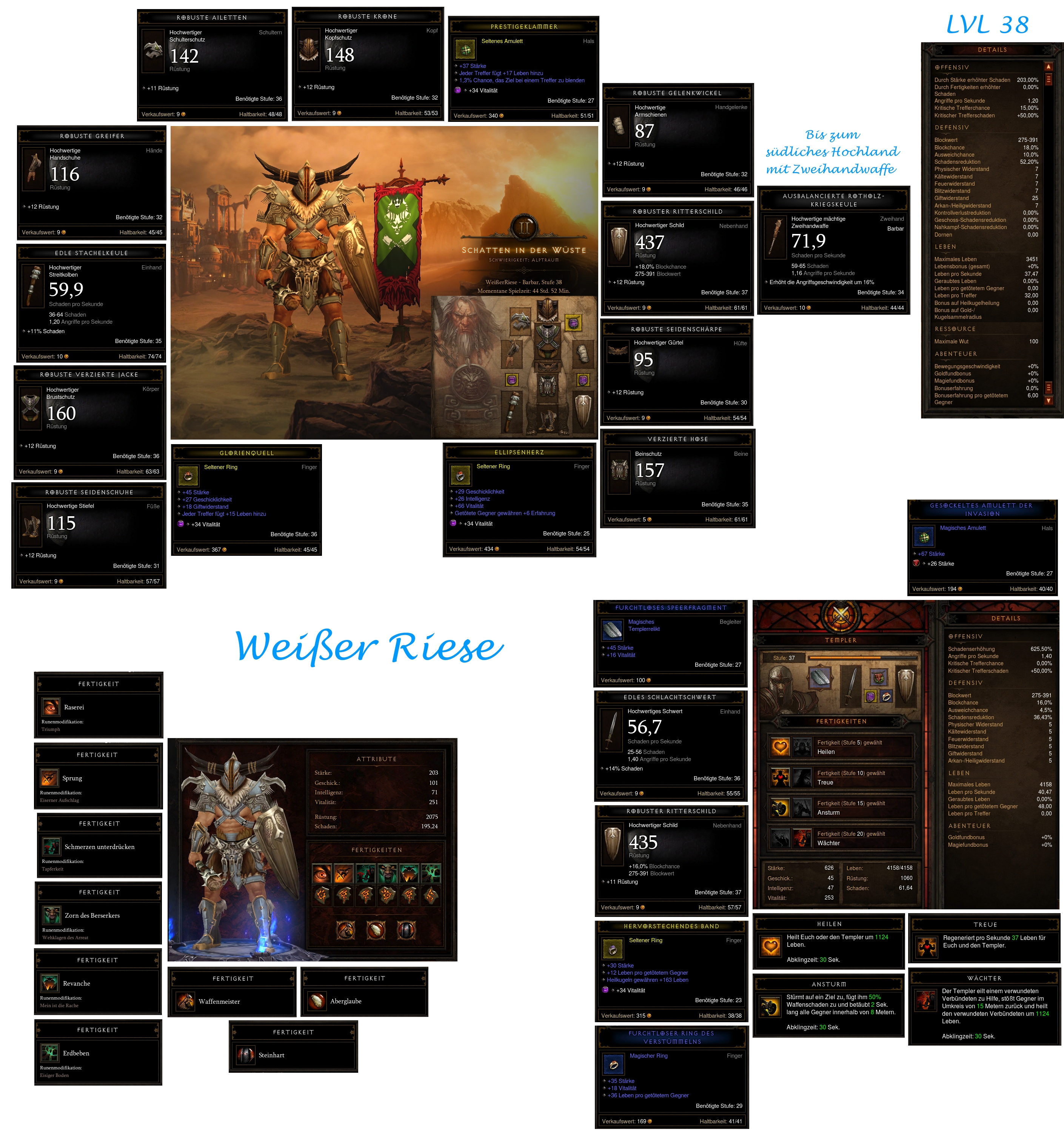 Der Weiße Riese mit ZHW Probleme ab südliches Hochland > dann EHW + Schild. Der geringere Schaden wurde aber durch ein gutes Schild und EHW mit hohem Minimalschaden wieder wet gemacht. Der Schlächter dauerte etwas. Primärfertigkeit: Raserei (R: Triumph) Sekundäre Fertigkeit: Sprung (R: Eiserner Aufschlag) 1 + 2: Schmerzen unterdrücken (R: Tapferkeit) + Zorn d. Berserkers (R: WdA) 3 + 4: Revanche (R: mein ist die Rache) + Erdbeben (R: Eisiger Boden) Passivfertigkeit: Waffenmeister + Aberglaube + Steinhart Begleiter: Templer mit Heilen + Treue + Ansturm + Wächter Tode:4 (3x Champion >Vereist+Schänder,1x Grul d.Verlorene>Illusion+Verseucht) |