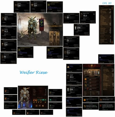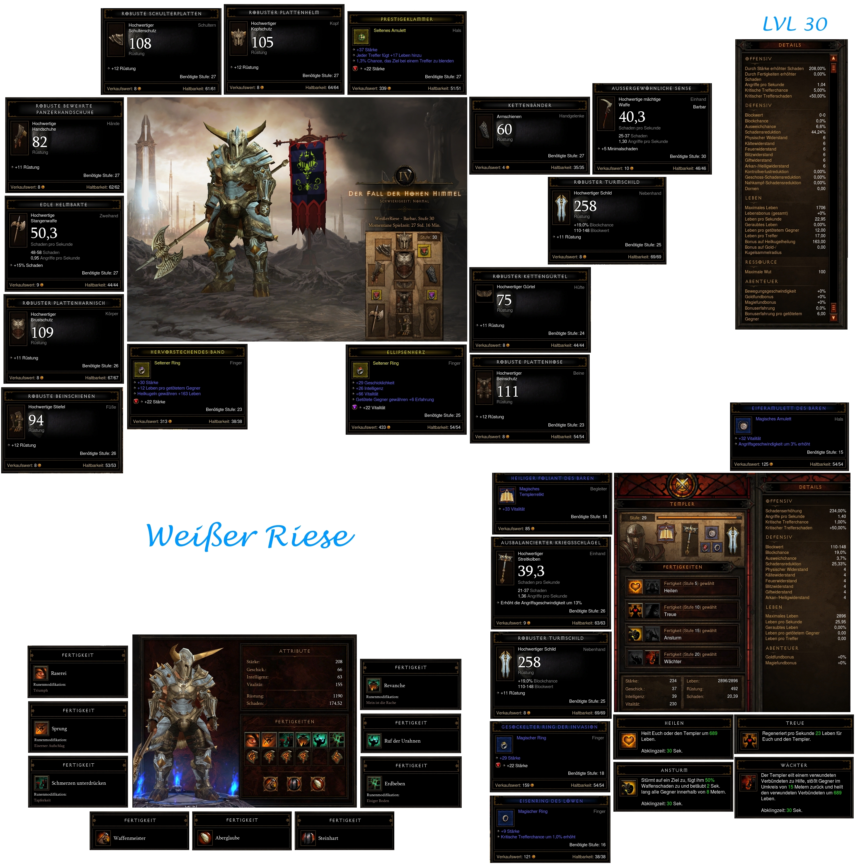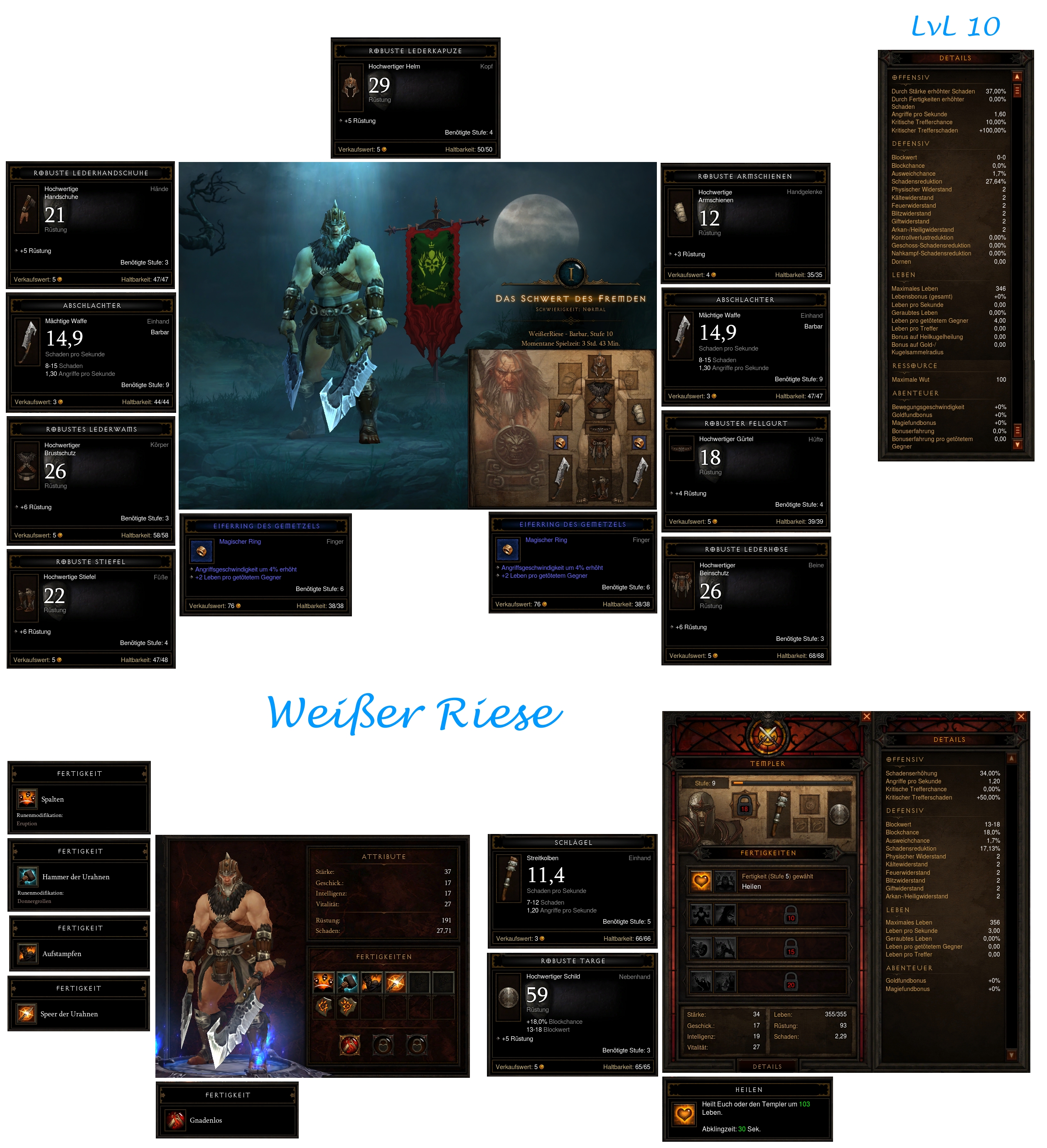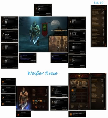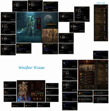 Der Barbar namens Weißer Riese hatte bis zum Skelettkönig keinerlei Probleme. Mit 2 Waffen hat es sich am besten gekämpft. Dank zweier LVL 6 - Ringe mit Schadenserhöhung hatte er einen guten Start. Primärfertigkeit: Spalten (R: Eruption) Sekundärfertigkeit: Hammer der Urahnen (R: Donnergrollen) 1+2: Aufstampfen und Speer der Urahnen 3+4: keine Passivfertigkeit: Gnadenlos Begleiter: Templer mit Heilen Tode: keine |