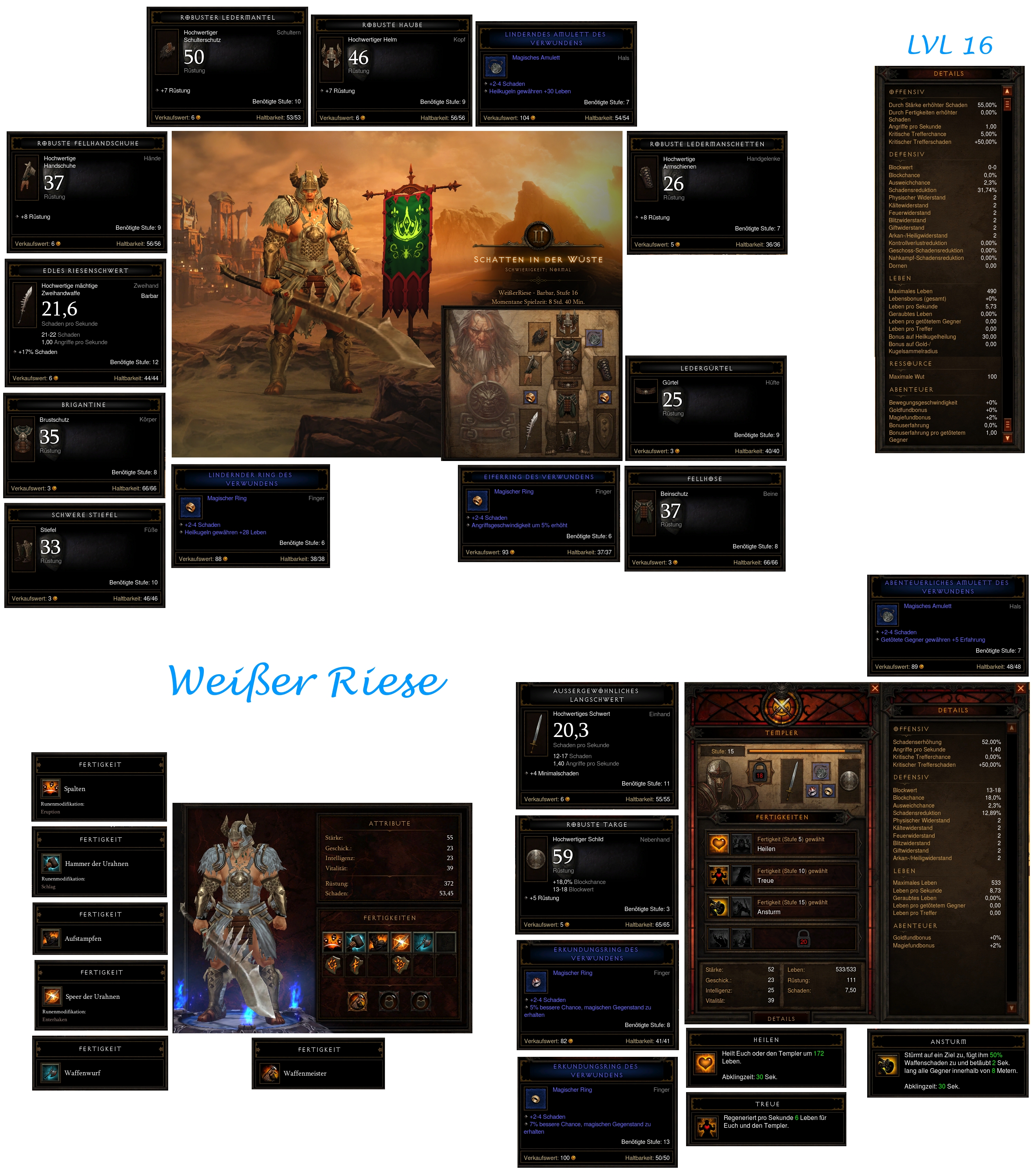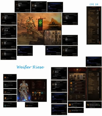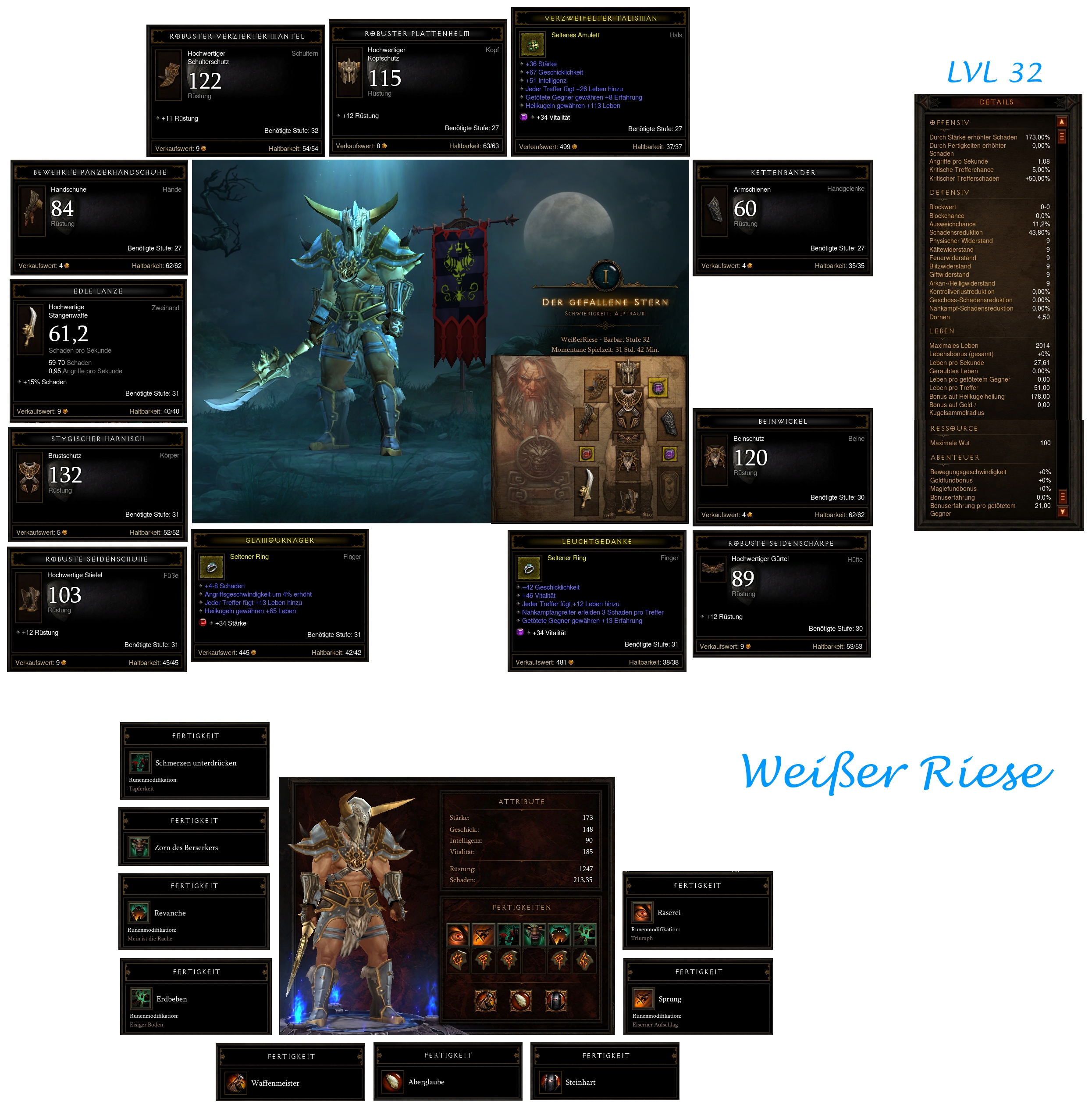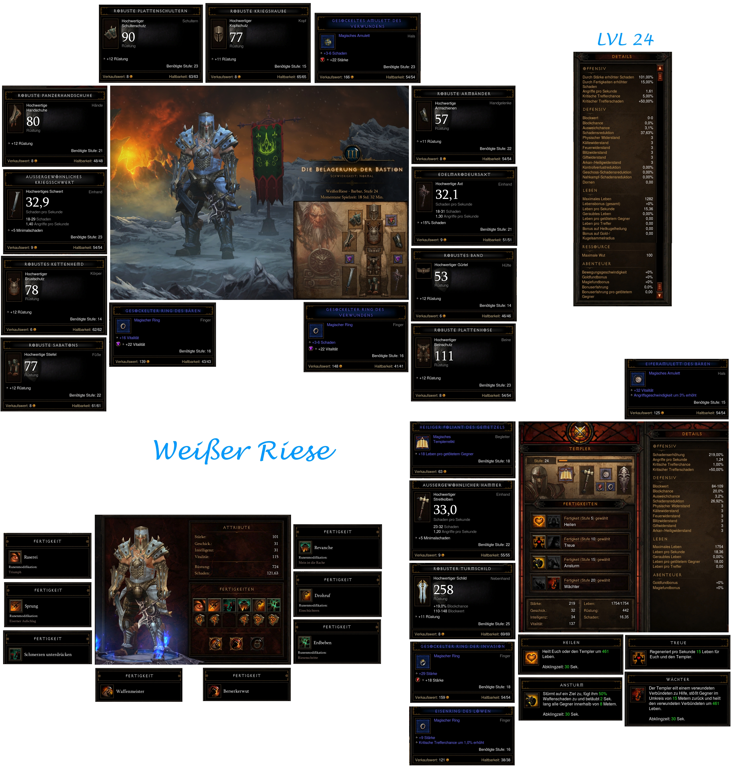 Der Barbar namens Weißer Riese hatte bis zum Skelettkönig keinerlei Probleme. Mit 2 Waffen hat es sich am besten gekämpft. Dank zweier LVL 6 - Ringe mit Schadenserhöhung hatte er einen guten Start. Primärfertigkeit: Spalten (R: Eruption) Sekundärfertigkeit: Hammer der Urahnen (R: Donnergrollen) 1+2: Aufstampfen und Speer der Urahnen 3+4: keine Passivfertigkeit: Gnadenlos Begleiter: Templer mit Heilen Tode: keine |