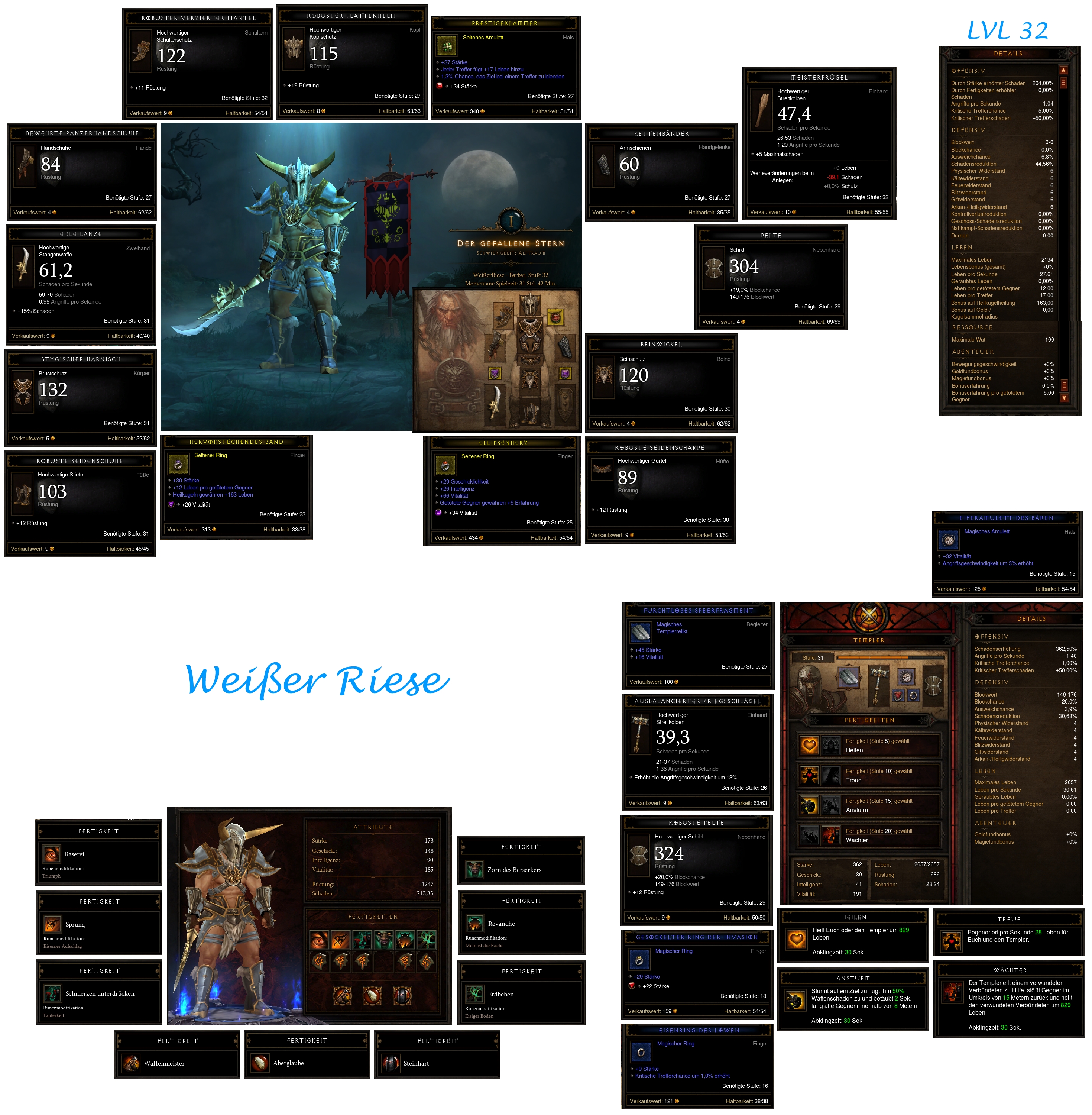 Weißer Riese bekam von Anfang an Probleme. Schild war gegen Bollwerkdämonen Pflicht, ansonsten machte sich eine Zweihandwaffe + hohem Grundschaden gut. Am Rakisübergang und Arreatkrater E2 hatte er viele Probleme (wenig Vitalität). Primärfertigkeit: Raserei (R: Triumph) Sekundärfertigkeit: Sprung (R: Eiserner Aufschlag) 1+2: Schmerzen unterdrücken (R: Tapferkeit)+ Revanche (R: Mein ist die Rache) 3+4: Ruf der Urahnen + Erdbeben (R: Eisiger Boden) Passivfertigkeit: Waffenmeister + Aberglaube + Steinhart Begleiter: Templer mit Heilen+Ansturm+Treue+Wächter Tode: 5x (2x Elitegegner+Diener mit Geschmolzen/Vereist/Rückstoß, 3x Caneo) |