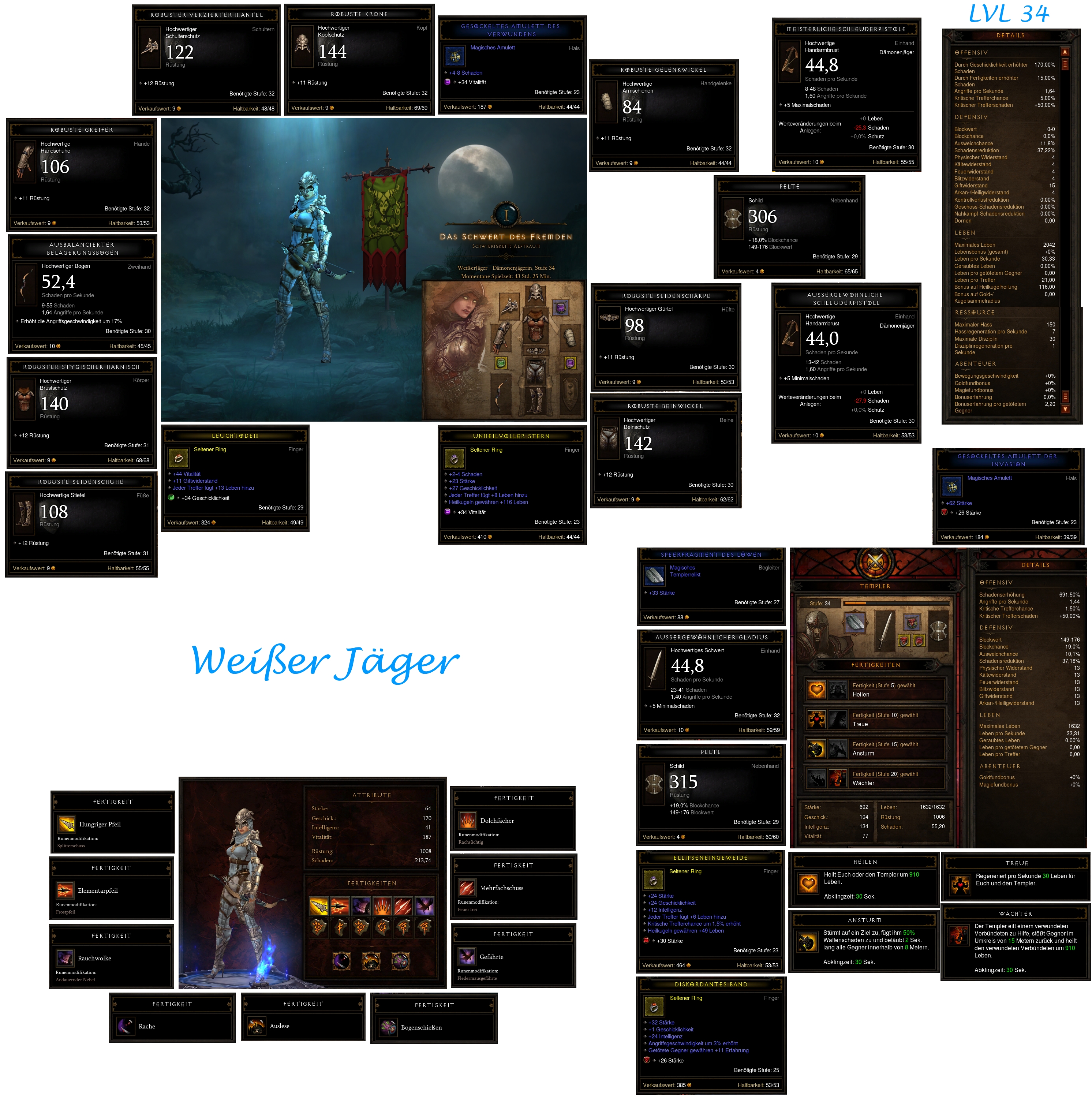 Der Weiße Jäger hat sich wie immer schwer getan. Ob nun ein schnellen Bogen oder 2 Handarmbrüste ist egal. Nur in engen Räumen ist ein Schild anzuraten. Ob man Vitalität oder Geschicklichkeit steigert, hängt von der Spielweise ab. Primärfertigkeit: Hungriger Pfeil (R: Splitterschuß) Sekundärfertigkeit: Elementarpfeil (R: Frostpfeil) 1+2: Rauchwolke (R: Andauernder Nebel) + Dolchfächer (R: Rachsüchtig) 3+4: Mehrfachschuß (R: Feuer frei) + Gefährte (R: Fledermausgefährte) Passivfertigkeit: Rache + Auslese + Bogenschießen Begleiter: Templer mit Heilen+Treue+Ansturm+Wächter Tode: 7x (6x bei Championgruppen oder Elitegegner & 1x beim Skelettkönig) |