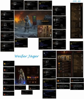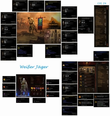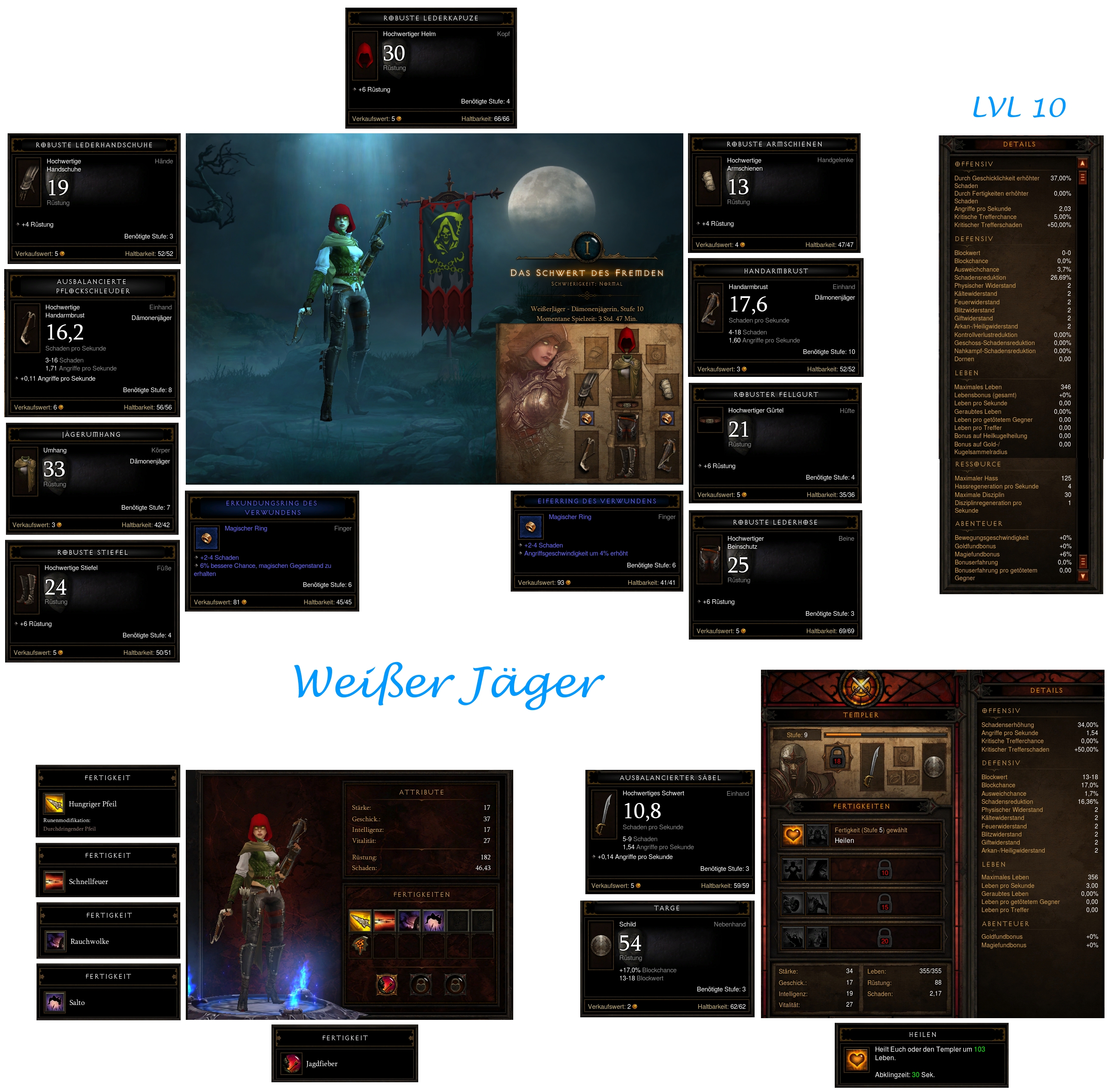 Der Dämonenjäger namens Weißer Jäger hatte am Anfang keine Probleme mit den Gegnern. Er musste immer in Bewegung bleiben und auch mal wegspringen, wenn viele Gegner auf einmal angriffen. 2 Einhandarmbrüste machten sich bestens. Primärfertigkeit: Hungriger Pfeil (R: Durchdringender Pfeil) Sekundärfertigkeit: Schnellfeuer 1+2: Rauchwolke + Salto 3+4: keine Passivfertigkeit: Jagdfieber Begleiter: Templer mit Heilen Tode: keine |