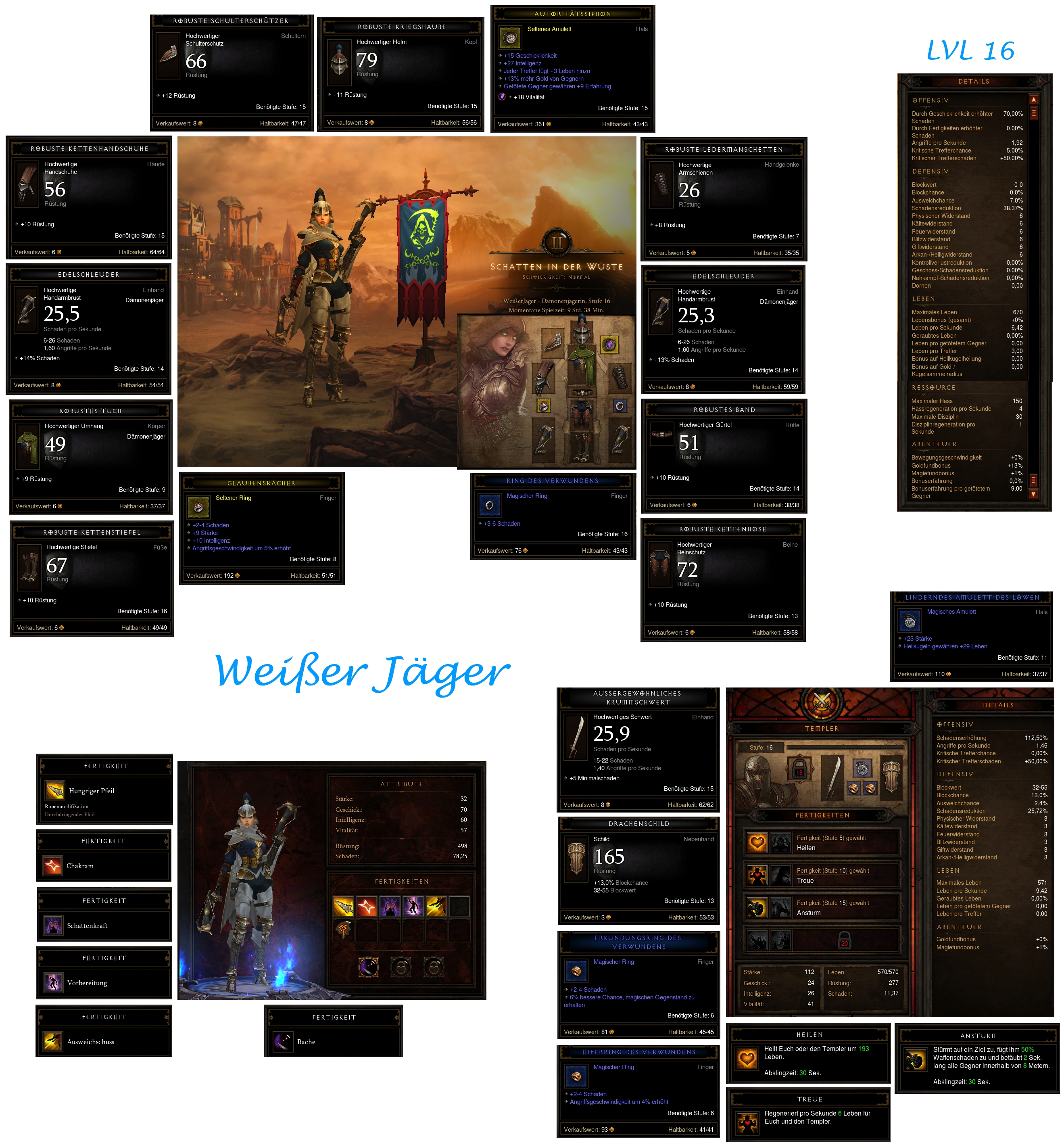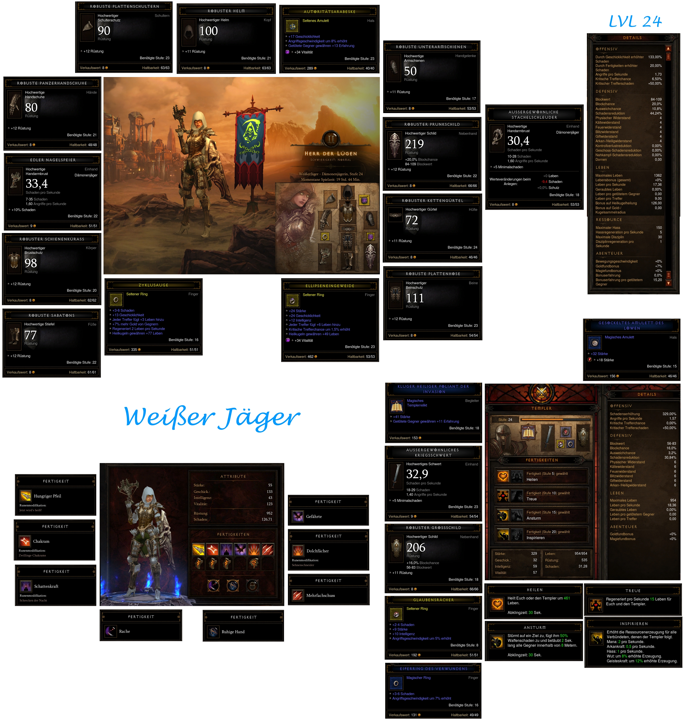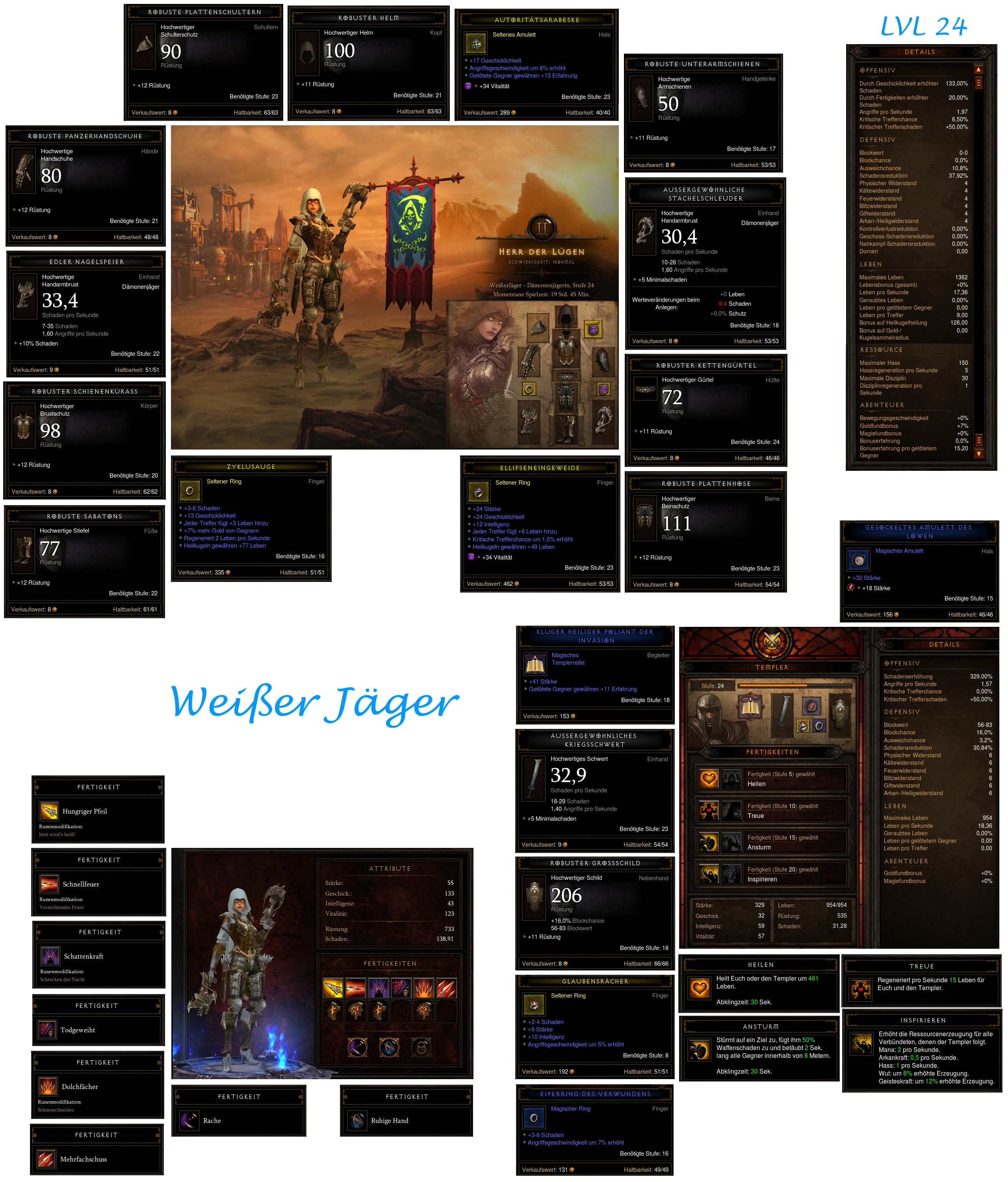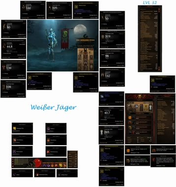Der Weißer Jäger kam meistens gut zurecht und hatte nur bei Nahkampfgegnern arge Probleme. 2 Einhandarmbrüste waren immer noch am besten. Ein Schild war nicht notwendig. In engen Höhlen wurde es oft gefährlich. Primärfertigkeit: Hungriger Pfeil (R: Durchdringender Pfeil) Sekundärfertigkeit: Chakram 1+2: Schattenkraft + Vorbereitung 3+4: Ausweichschuss + keine Passivfertigkeit: Rache Begleiter: Templer mit Heilen+Treue+Ansturm Tode: 1 (1x durch das Feuer vom Boden beim Schlächter) |