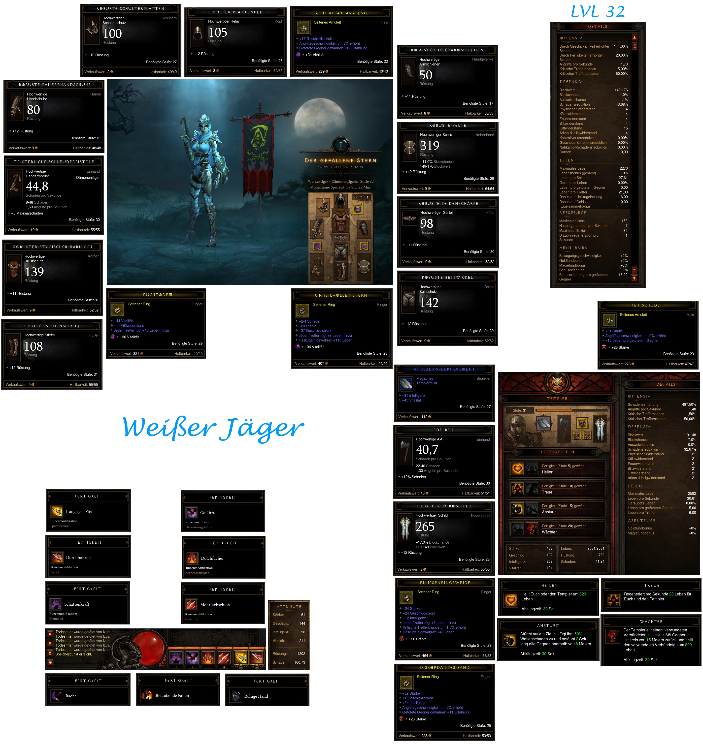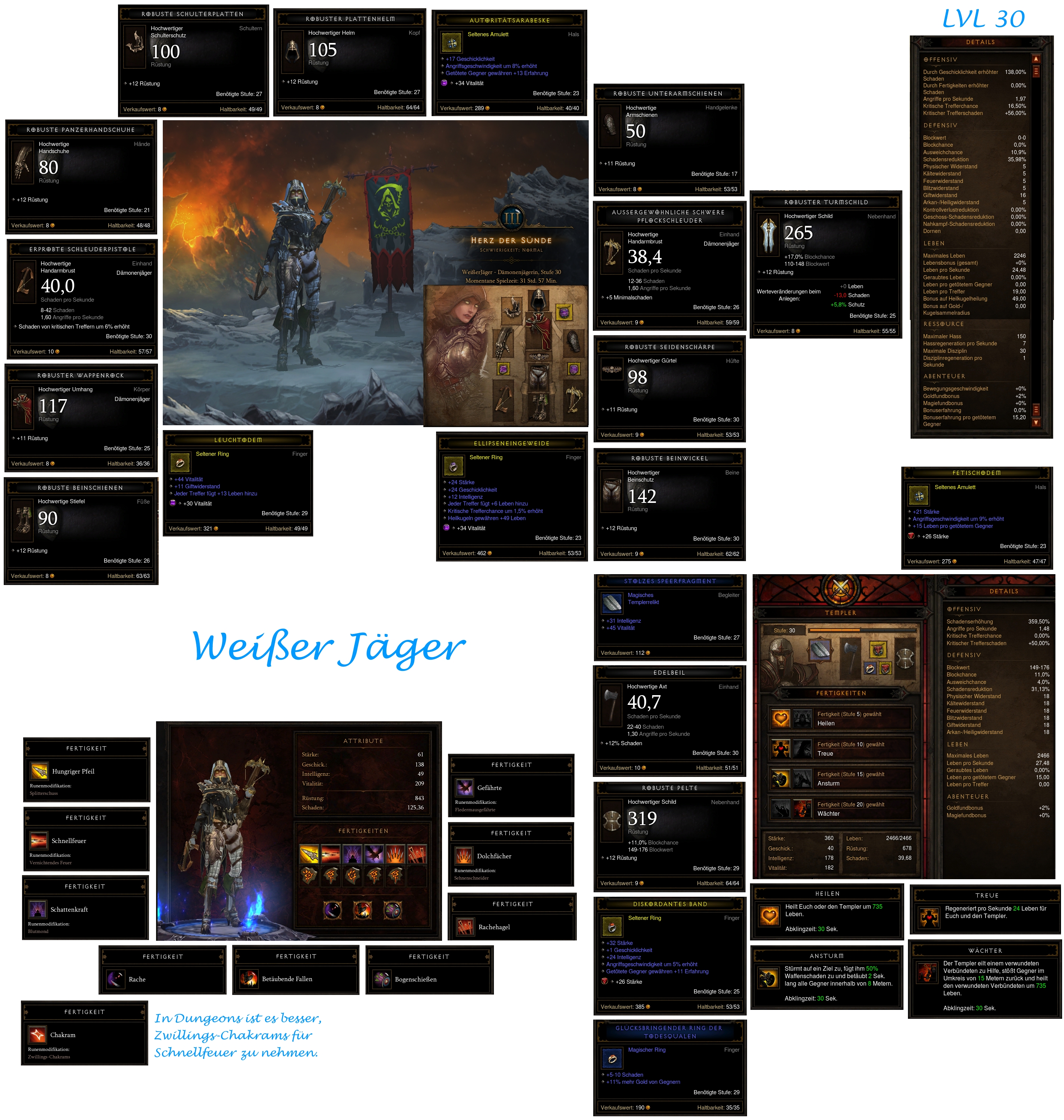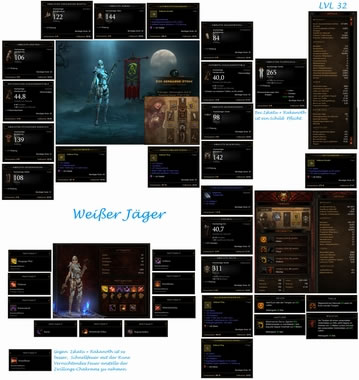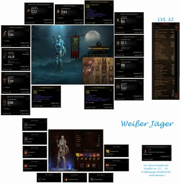Wenn man bis jetzt noch nicht 32 ist, sollte man auf der Himmelszinne leveln und erst dann gegen Diablo antreten, da man die Rune Rachsüchtig benötigt. Erst nachdem der Weiße Jäger sich passende Ringe+Amulet vom Weißen Mönch geborgt hatte, konnte er Diablo besiegen. Vorher war zu wenig Vitalität und Leben je Treffer da. Immer zwischen den Heilbrunnen pendeln und Dolchfächer mit Rachsüchtig aktiv halten. Im Schattenreich evtl. in den hinteren Bereich verziehen. Schild ist Pflicht. Immer in Bewegung bleiben und kurze Feuerstöße. Primärfertigkeit: Hungriger Pfeil (R: Jetzt wirds heiss) Sekundärfertigkeit: Schnellfeuer (R: Vernichtendes Feuer) 1+2: Schattenkraft (R: Blutmond) + Gefährte (R: Fledermausgefährte) 3+4: Dolchfächer (R: Rachsüchtig) + Mehrfachschuss (R: Feuer frei) Passivfertigkeit: Rache + Betäubende Fallen + Bogenschießen Ringe/Amulett: Sockel/Leben je Treffer/Vitalität/Geschicklichkeit Sockelung: bestmöglichen Amethyst Tode: 3 (2x im Schattenreich und 1x im 3. Teil durch Knochenkäfig) |