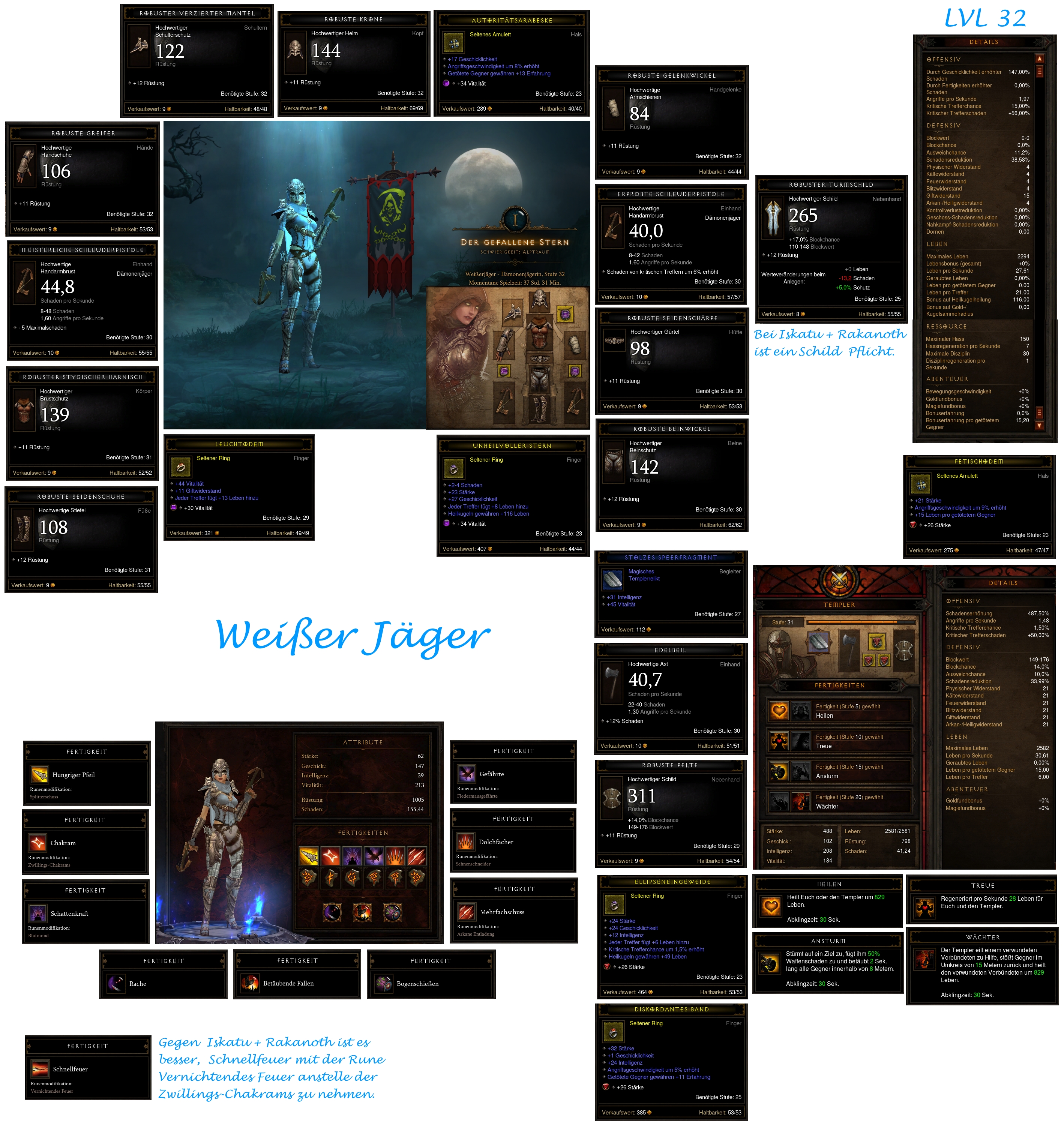 Weißer Jäger hatte vor allen Dingen gegen Iskatu & Rakanoth Schwierigkeiten - erst nachdem er ein Schild und Schnellfeuer benutzte, konnte er sie besiegen. Ansonsten waren 2 Armbrüste und Zwillings-Chakram ok. Vitalität war zu wenig. Primärfertigkeit: Hungriger Pfeil (R: Splitter) Sekundärfertigkeit: Chakram (R: Zwillings-Chakram) 1+2: Schattenkraft (R: Blutmond) + Gefährte (R: Fledermausgefährte) 3+4: Dolchfächer (R: Sehnenschneider) + Mehrfachschuss (R: Arkane Entladung) Passivfertigkeit: Rache + Betäubende Fallen + Bogenschießen Begleiter: Templer mit Heilen+Ansturm+Treue+Wächter Tode: 3 (1x Championgruppe > Aufseher+Geschmolzen, 1x Iskatu, 1x Rakanoth) |