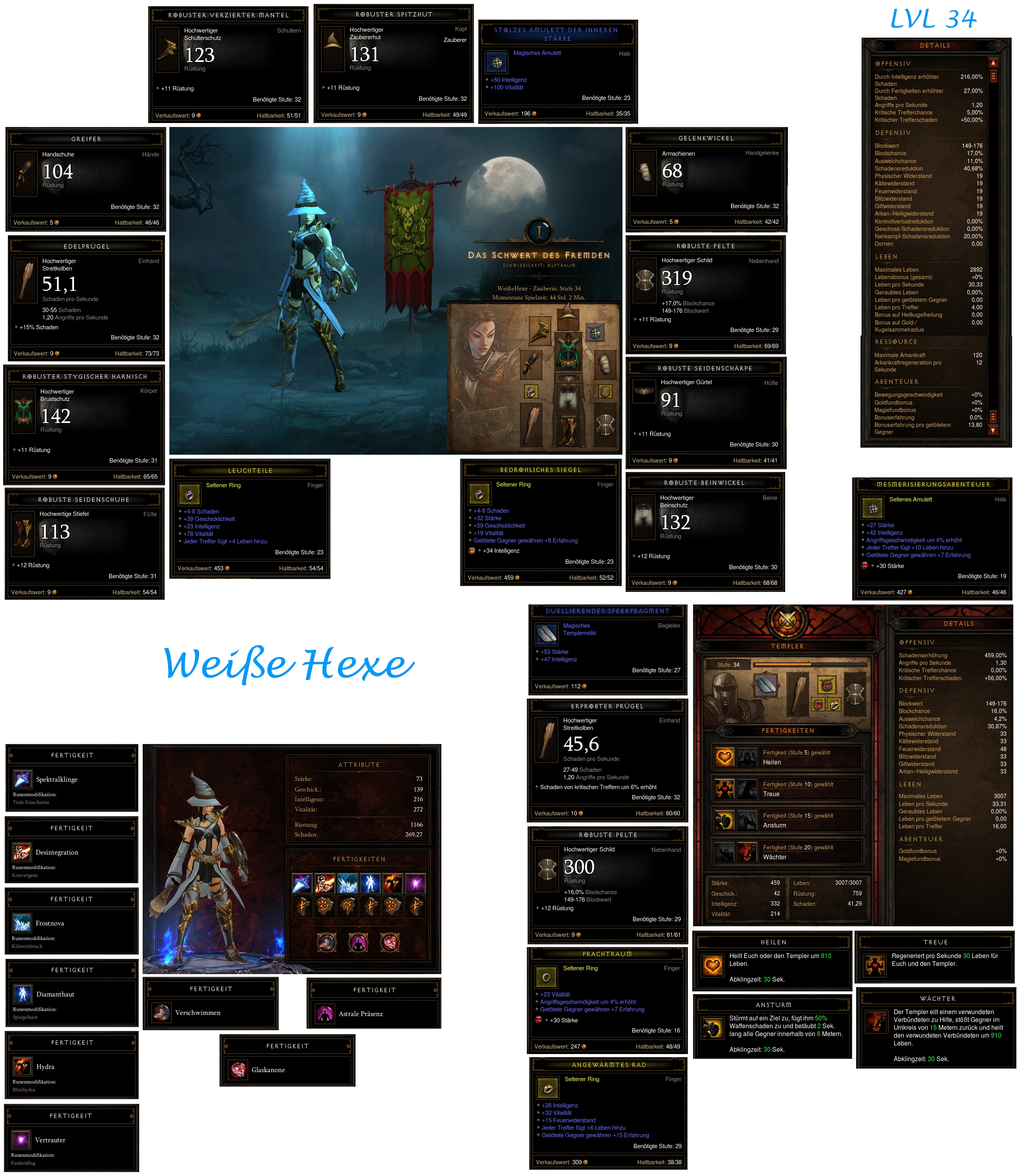 Die Weiße Hexe hatte bis hier überraschenderweise keine Probleme und hat sich oft mit Diamanthaut gerettet. Ein Schild ist Pflicht, da sie sich mit Spektralklinge verteidigt. Ein vernünftiges Verhälltnis zwischen Intelligenz & Vitalität ist wichtig. Primärfertigkeit: Spektralklinge (R: Tiefe Einschnitte) Sekundärfertigkeit: Desintegration (R: Konvergenz) 1+2: Frostnova (R: Kälteeinbruch) + Diamanthaut (R: Spiegelhaut) 3+4: Hydra (R: Blitzhydra) + Vertrauter (R: Funkenflug) Passivfertigkeit: Verschwimmen + Astrale Präsenz + Glaskanone Begleiter: Templer mit Heilen+Treue+Ansturm+Wächter Tode: keine (dank Diamanthaut und Hydra) |