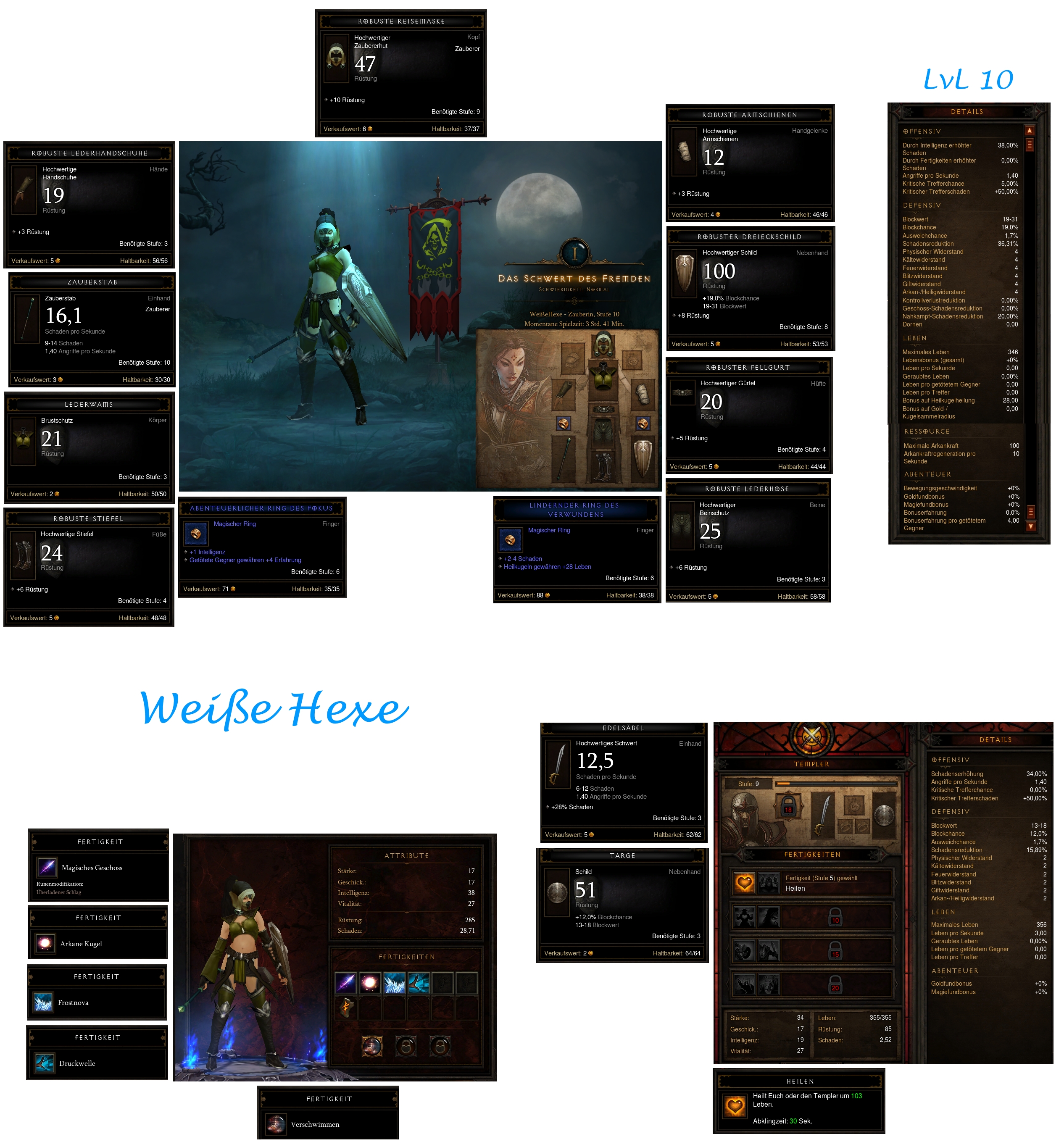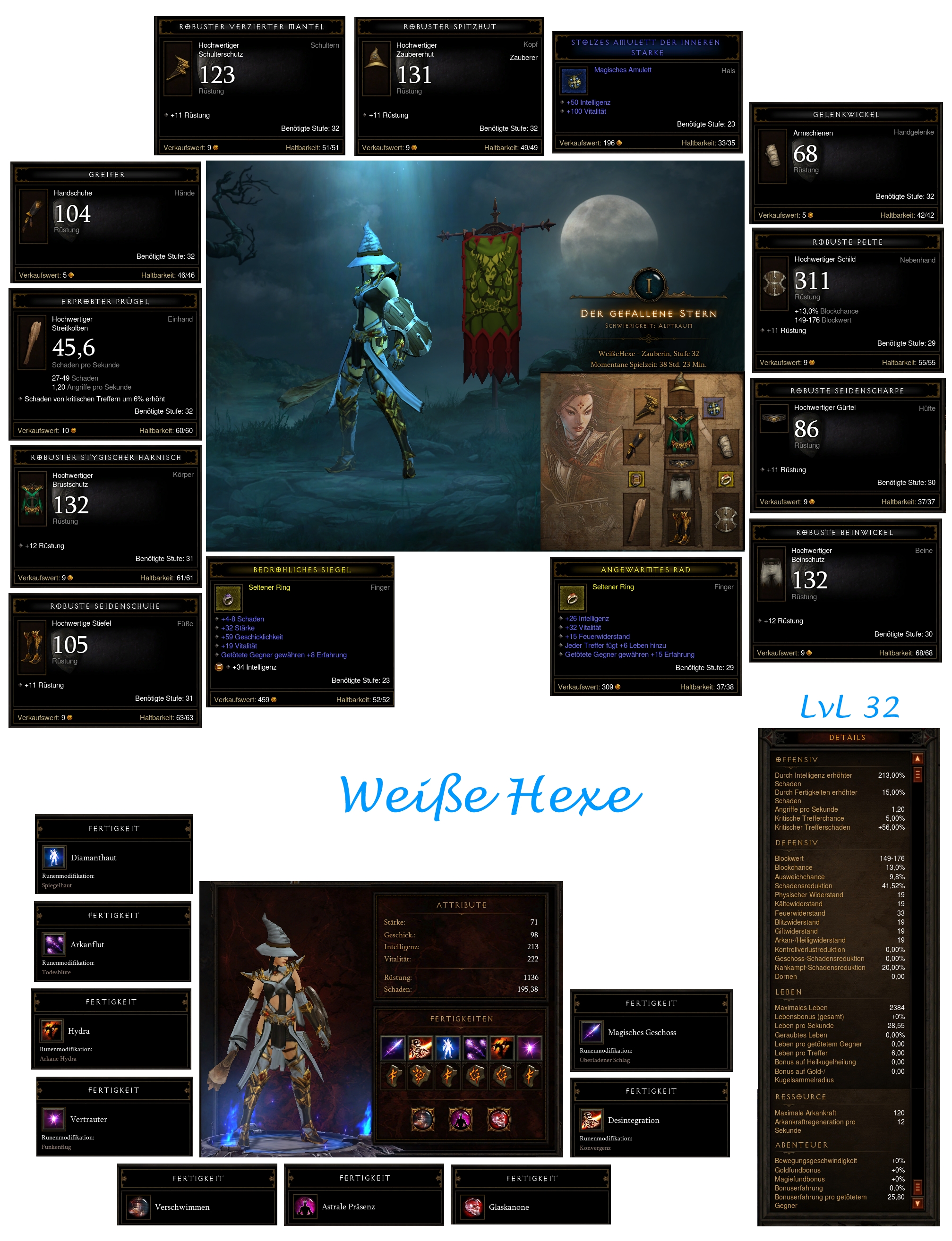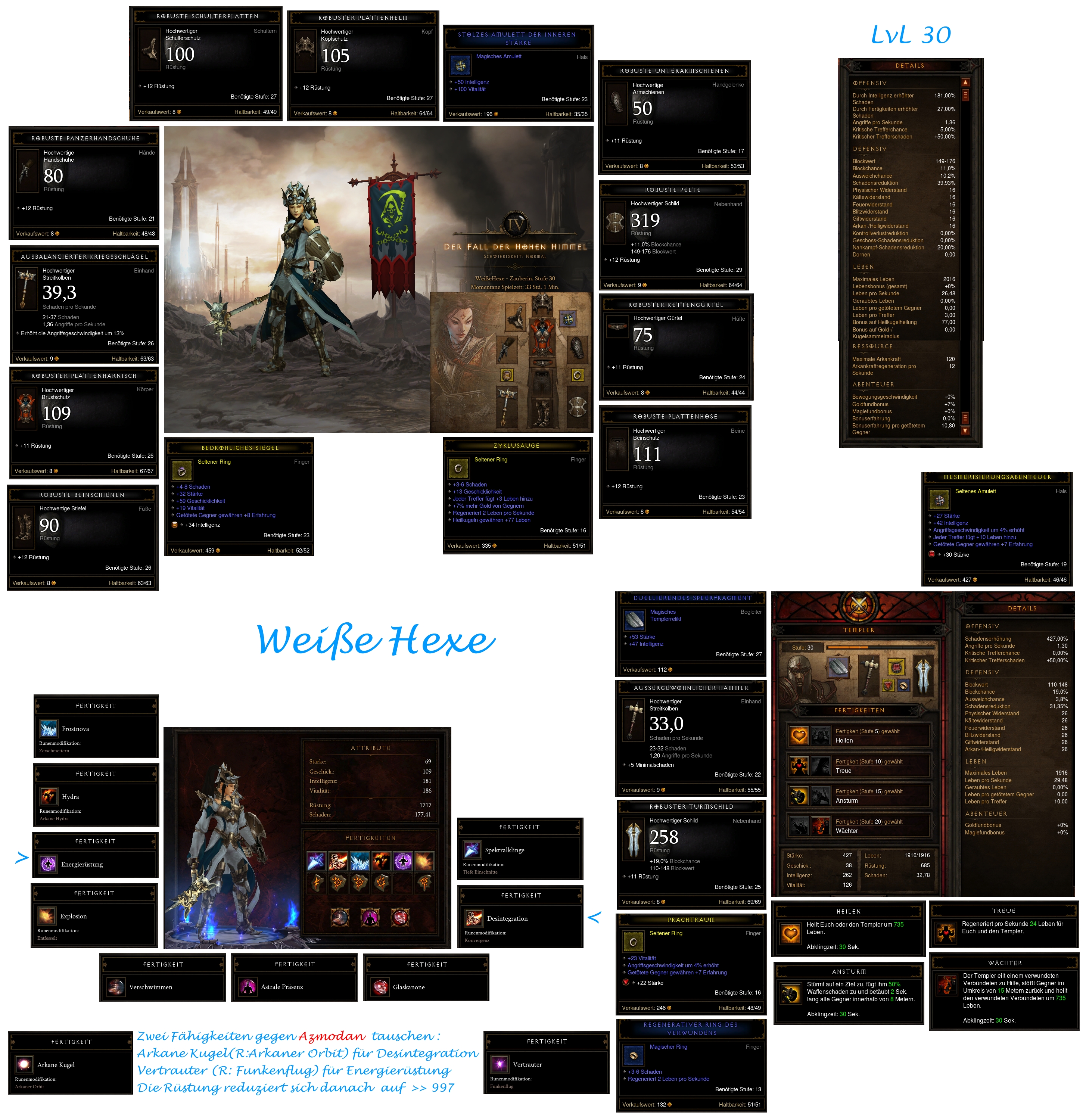 Weiße Hexe hatte Anfangs kaum Probleme - ab Rakkisübergang war es schwer. Azmodan wurde erst nach Umskillen besiegt (Arkane Kugel mit R: Arkaner Orbit für Desintegration & Vertrauter mit R: Funkenflug für Energierüstung). Primärfertigkeit: Spektralklinge (R: Tiefe Einschnitte) Sekundärfertigkeit: Desintegration (R: Konvergenz) 1+2: Frostnova (R: Zerschmettern) + Hydra (R: Arkane Hydra) 3+4: Energierüstung + Explosion (R: Entfesselt) Passivfertigkeit: Verschwimmen + Astrale Präsenz + Glaskanone Begleiter: Templer mit Heilen+Treue+Ansturm+Wächter Tode: 5 (2x durch Bollwerk-Elite & Diener, 3x durch Azmodans Magmakugel) |