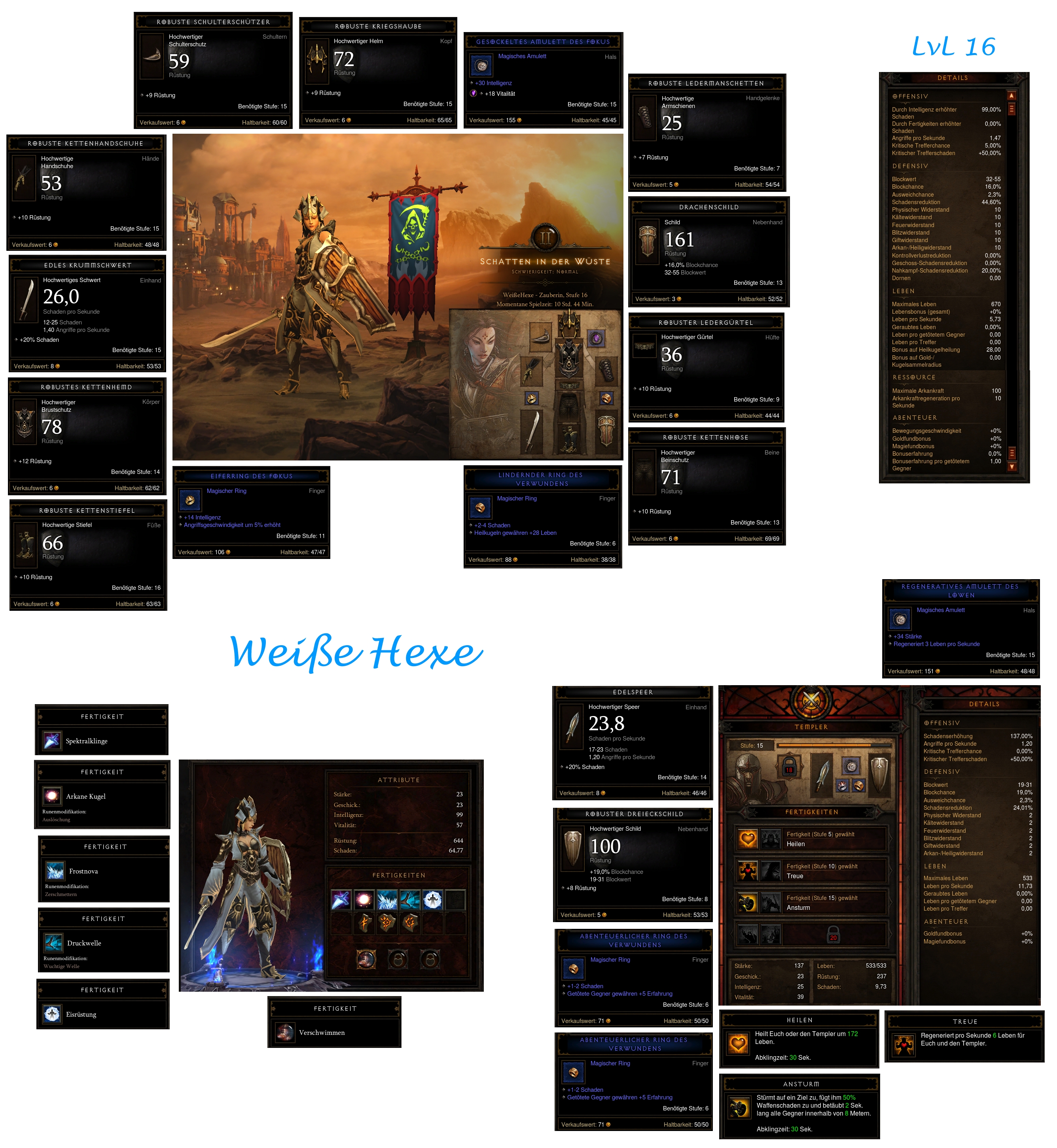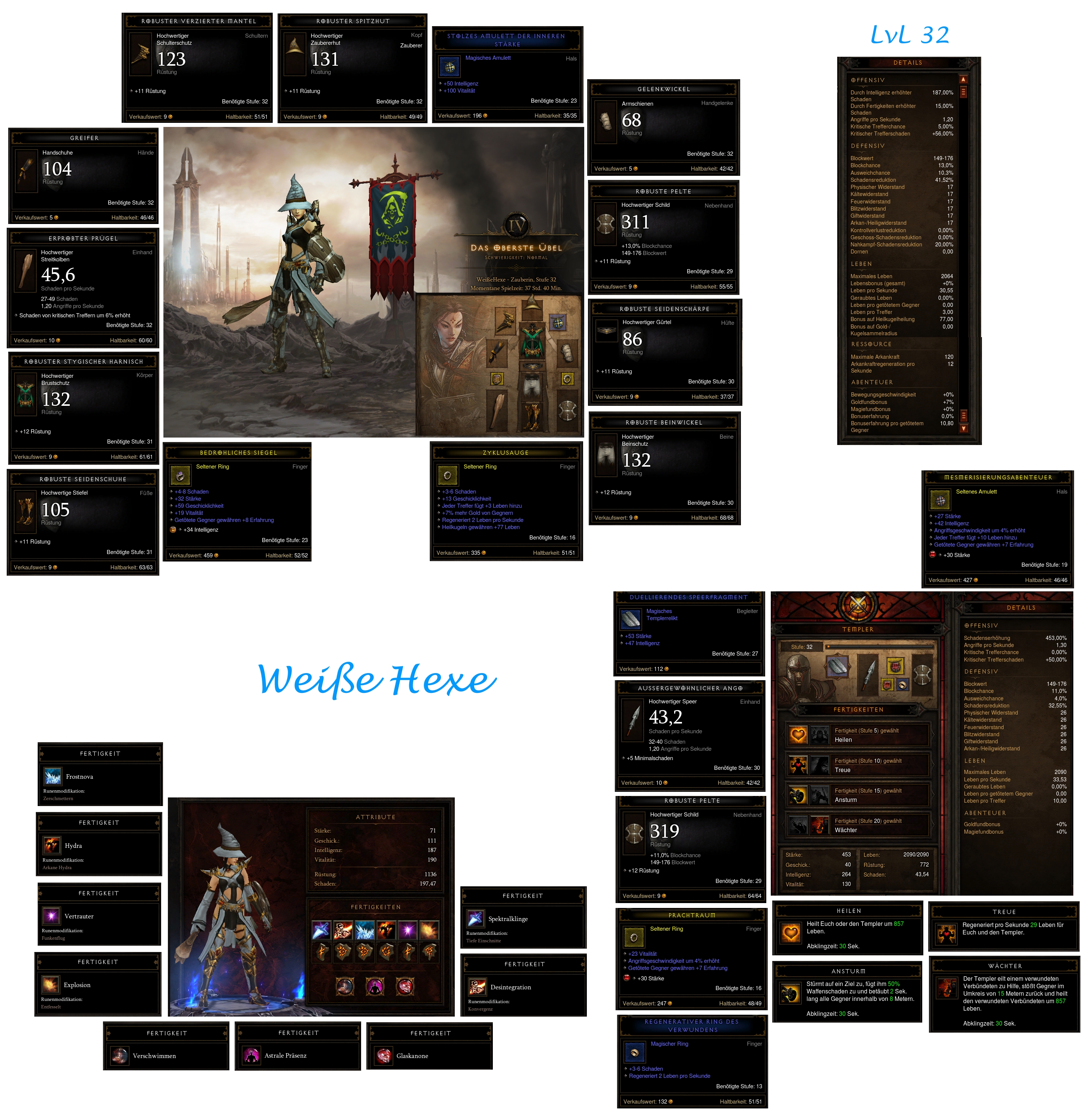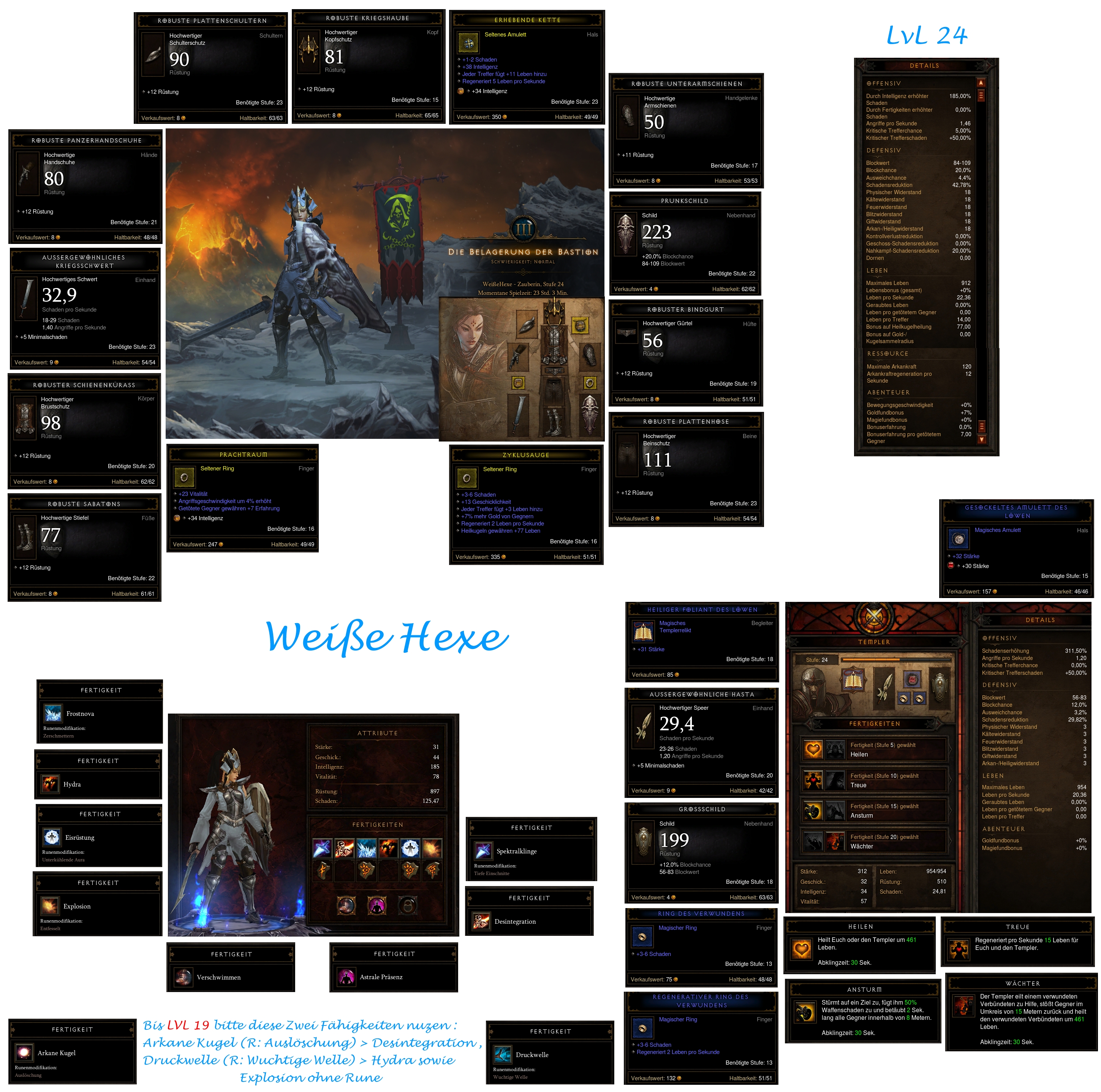 Auch hier hatte Weiße Hexe am Anfang wenig Probleme. Lediglich Champions mit Dienern, welche Verseucht oder Illusionist hatten wurden gefährlich. Belial wurde von der Hydra erledigt. Ein guter Schild mit hoher Blockchance is wichtig. Primärfertigkeit: Spektralklinge (R: Tiefe Einschnitte) Sekundärfertigkeit: Desintegration 1+2: Frostnova (R: Zerschmettern) + Hydra 3+4: Eisrüstung (R: Unterkühlende Aura) + Explosion (R: Entfesselt) Passivfertigkeit: Verschwimmen + Astrale Präsenz Begleiter: Templer mit Heilen+Treue+Ansturm+Wächter Tode: keine |